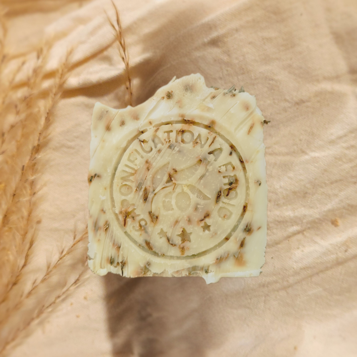 Savon surgras saponifié à froid. La saponification à froid est une méthode artisanale qui permet de produire des savons surgras riches en glycérine végétale. Les savons reposent un mois avant utilisation. Nos savons sont fabriqués, coupés et emballés à la main.